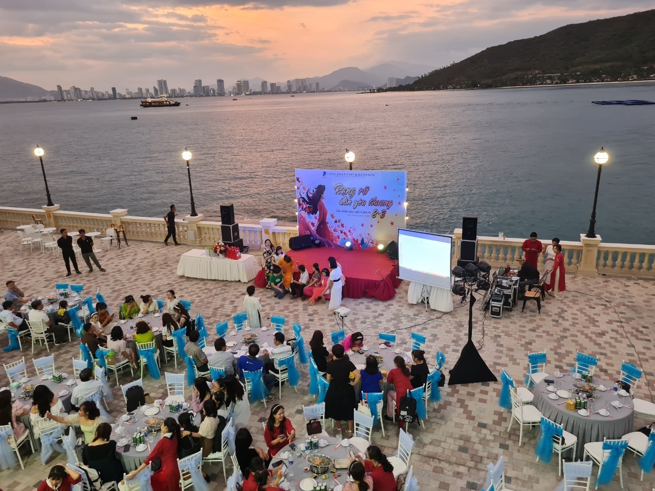 🔔 Không gian tiệc ngoài trời mặt biển nhìn về trung tâm thành phố Nha Trang được trang bị sân khấu đầy đủ âm thanh, ánh sáng, màn hình Led sẵn sàng phục vụ các đêm tiệc sôi động với sức chứa lên đến 800 khách.